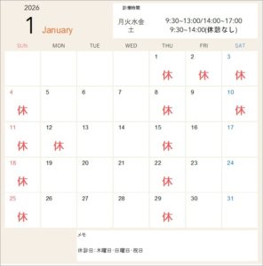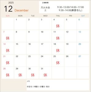 2025年12月28日(日)から2026年1月4日(日)までは休診とさせて頂きます。